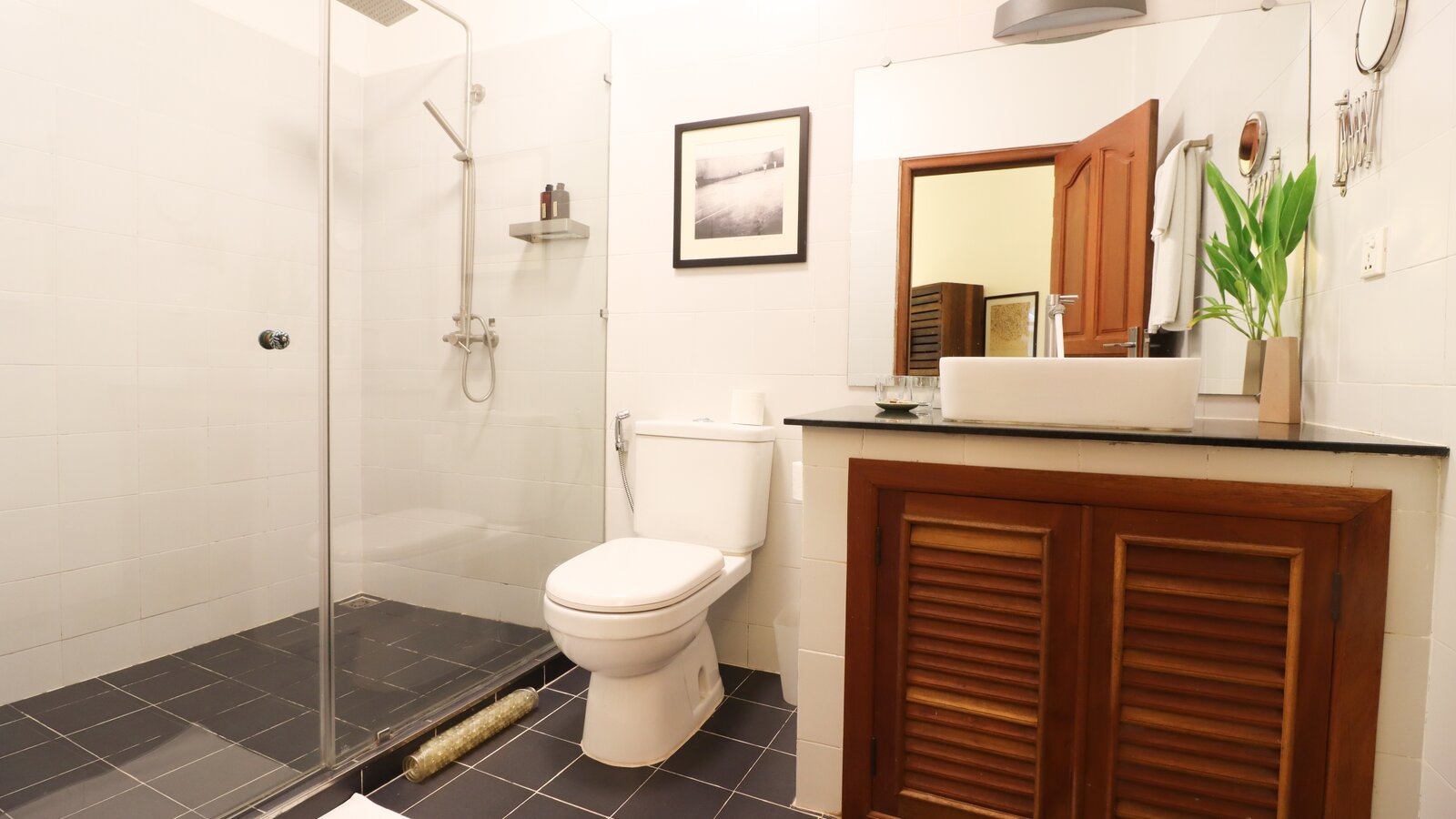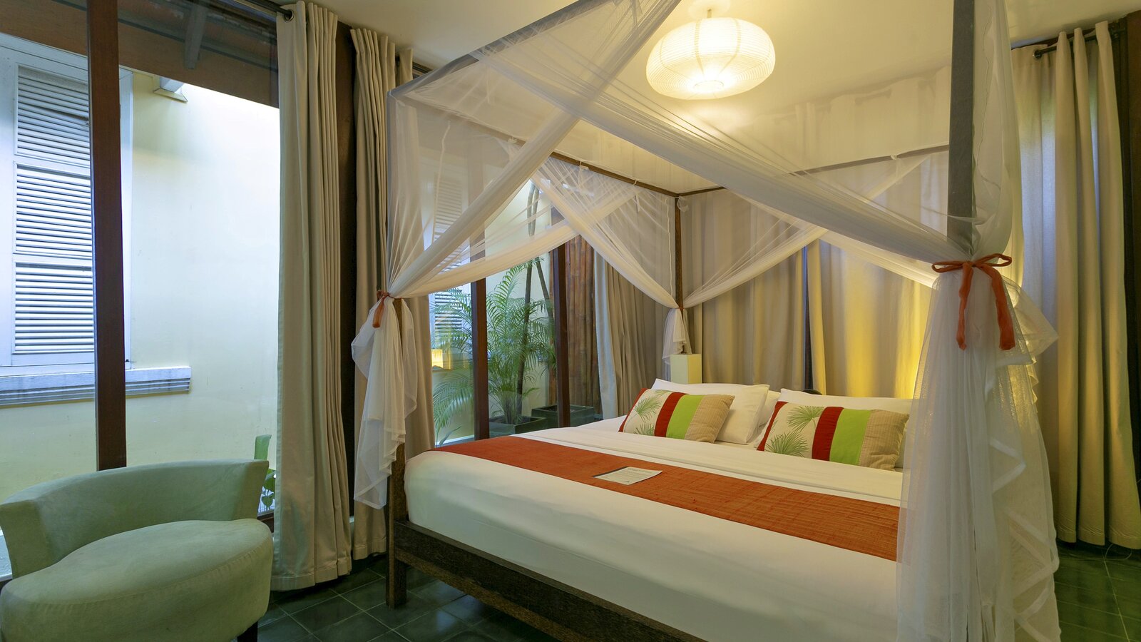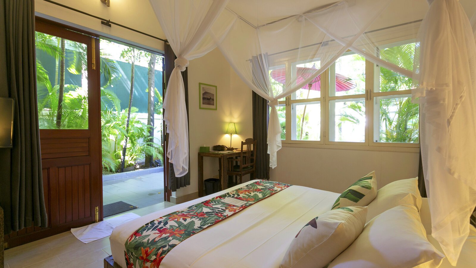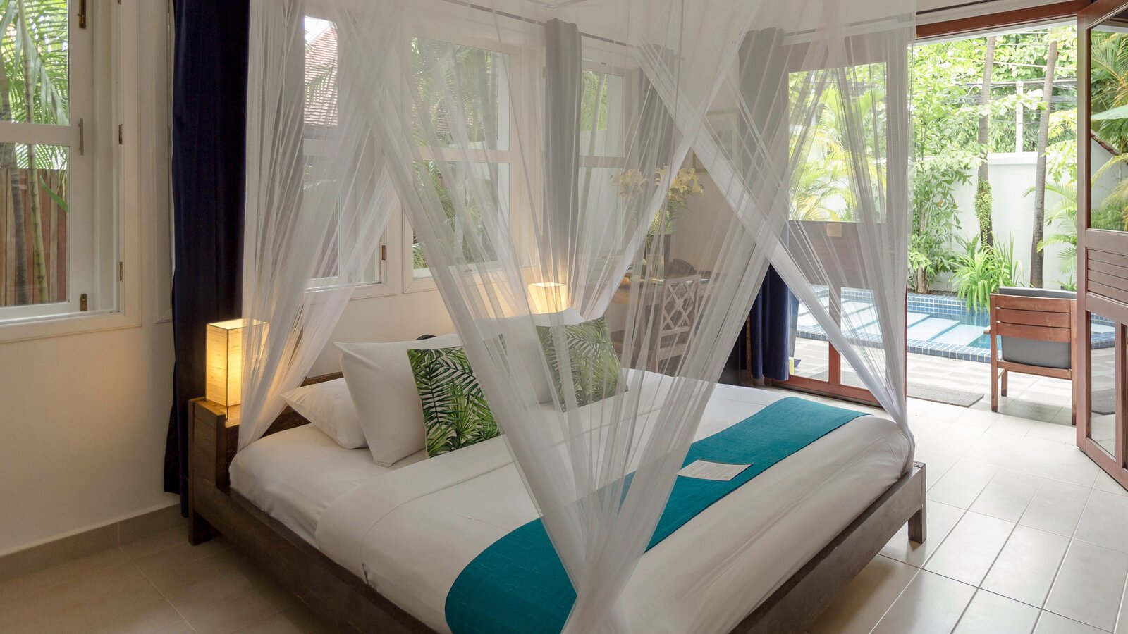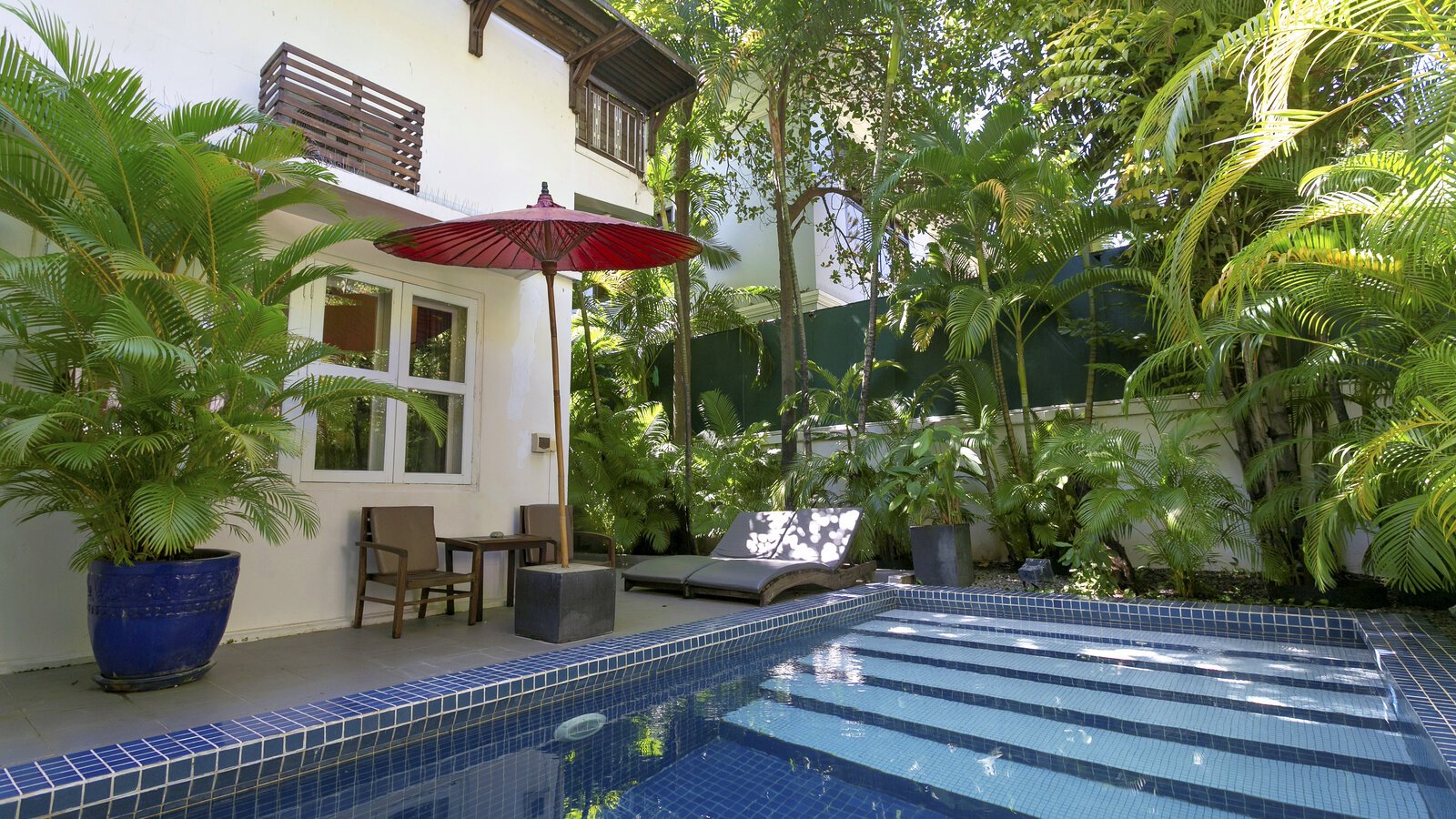 The ideal hideaway for a romantic stay in Phnom Penh, with the bedroom and separate bathroom opening to a private patio and its 6 x 3 m plunge pool (not heated). (Note: sink does not run hot water).